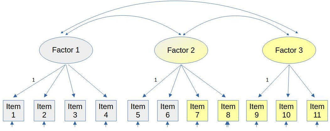 Here the items assigned to factor 1 actually belong to two separate factors. Even though there won’t be an explicit modification suggestion as part of the modification indices there will be indirect clues.