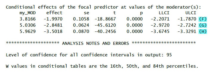 Even though the limited code above gives you the moderation test in many cases you want to have additional information. Following are some additional PROCESS parameters that could be helpful for your test whether there is an interaction.